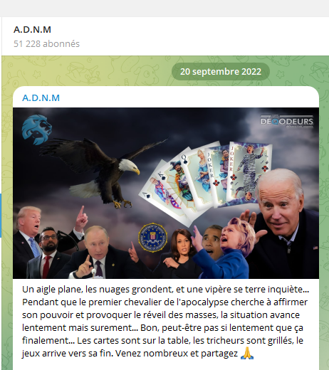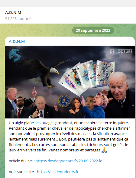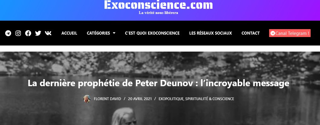 4/n : Et il souligne avec pertinence cette dérive mystique qui touche presque toutes les composantes de l’ancienne nébuleuse QAnon. Les éléments francophones, comme par ex. «Exoconscience» d’Angelo Alers, un ancien comparse de Julian Wolf dans « le Grand Réveil »