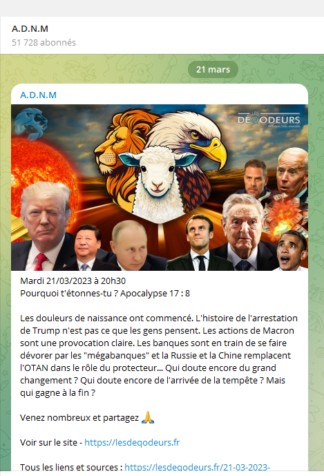 6/n : Dés début 2022, Leonardo Sojli et les Déqodeurs se sont de plus en plus engagés sur cette voie. De l’effondrement évoqué dans les cosmologies QAnon, leurs narratifs évoquent de plus en plus souvent l’Apocalypse, notamment selon le 7èmelivre de l’apôtre Jean
