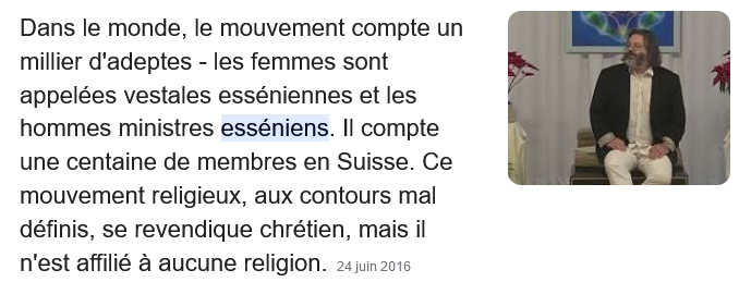 17/n. Mais cette église essénienne inquiète. D’aucuns estiment qu’elle suit la ligne de l’OTS (Ordre du Temple Solaire » de sinistre mémoire. Mais la Suisse, qui ne connaît pas les termes «Dérive sectaire» dans son droit pénal, ne fait rien… rts.ch/info/suisse/75…