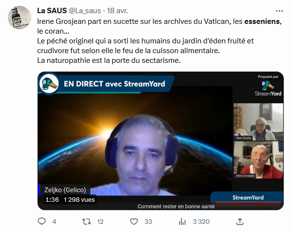 27 : Mais il y a bien eu conversion, Sojli l’a plusieurs fois avoué dans ses lives. Après, que ce soit à l’Eglise essénienne de Manitara ou à une autre, voire à une composante ou à une branche essénienne qu’ils cherchent à créer, c’est leur problème.