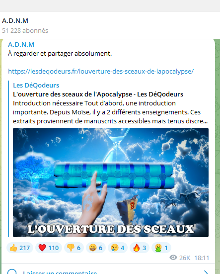 5/n : On le constate clairement, la rhétorique reprise par les DéQodeurs, par ainsi que d’autres groupes ou «thérapeutes» se rapproche de plus en plus de celle des sectes dites «apocalyptiques» ou «millénaristes», avec toutes les problématiques d’emprises qu’elles véhiculent.