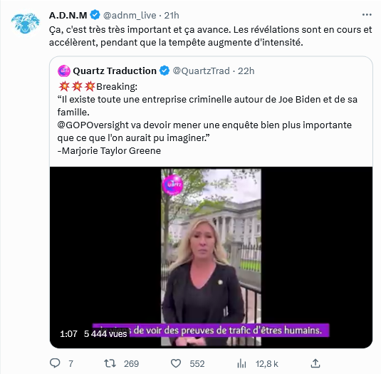 25/n : Bon, pour le moment, on ne voit pas grande différence. Ils déQodent toujours, conservant leur rhétorique et leurs narratifs conformes à la cosmogonie QAnon. Avec toutefois une agressivité accrue envers les fact-checkers qu’ils fustigent quotidiennement maintenant…