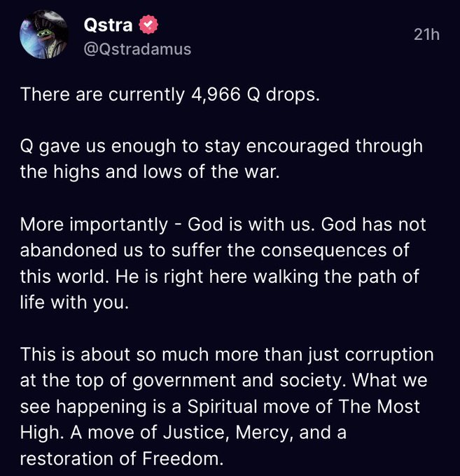 2/n : On avait remarqué depuis une année une dérive des DéQodeurs vers des narratifs de plus en plus mystiques dans leurs communications et lors de leurs lives. Partant de l’»analyse » de l’actualité selon la Qosmogonie QAnon, le terme « spiritualité » est progressivement apparu.