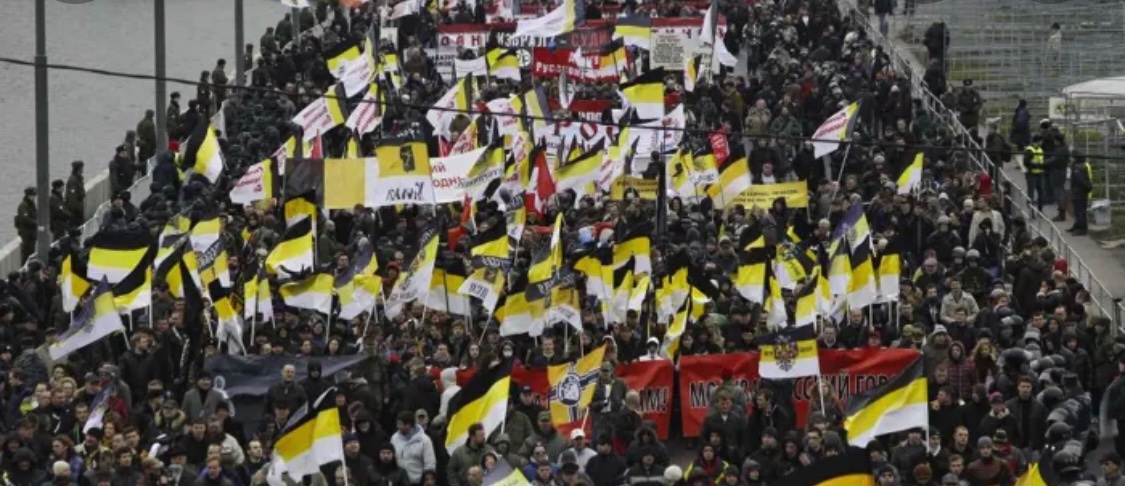 2/n : Le Mouvement Impérial Russe (MIR) est une organisation d’extrême-droite suprémaciste et ethno-nationaliste. Fondé par Stanislav Vorobyev en 2002 à Saint-Pétersbourg, il appelle à la restauration de l’empire et du régime tsariste en Russie dont il reprend les couleurs.