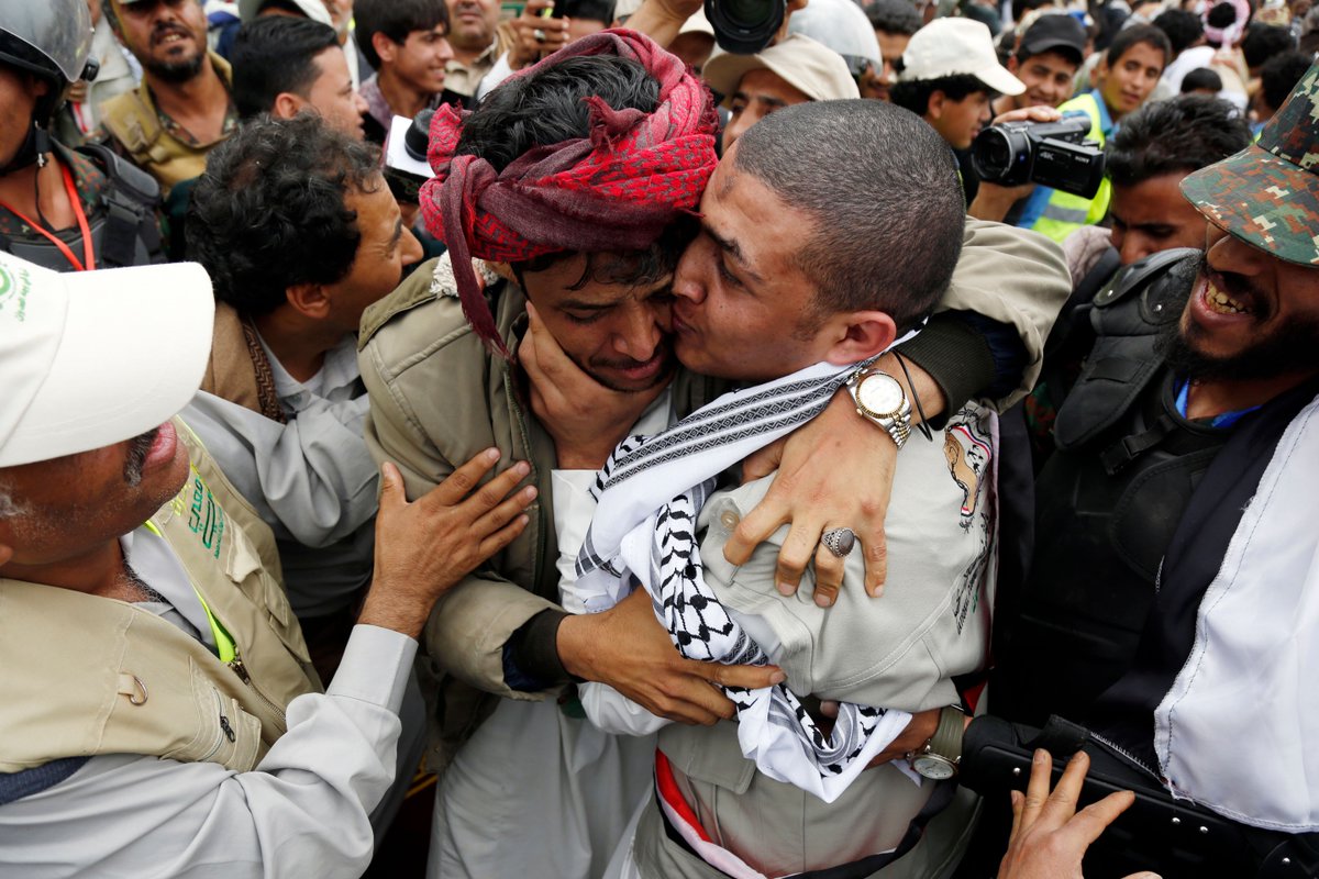 Sanaa, Yemen – A prisoner of war taken during the Yemeni conflict is welcomed by relatives after he was freed in a prisoner exchange.