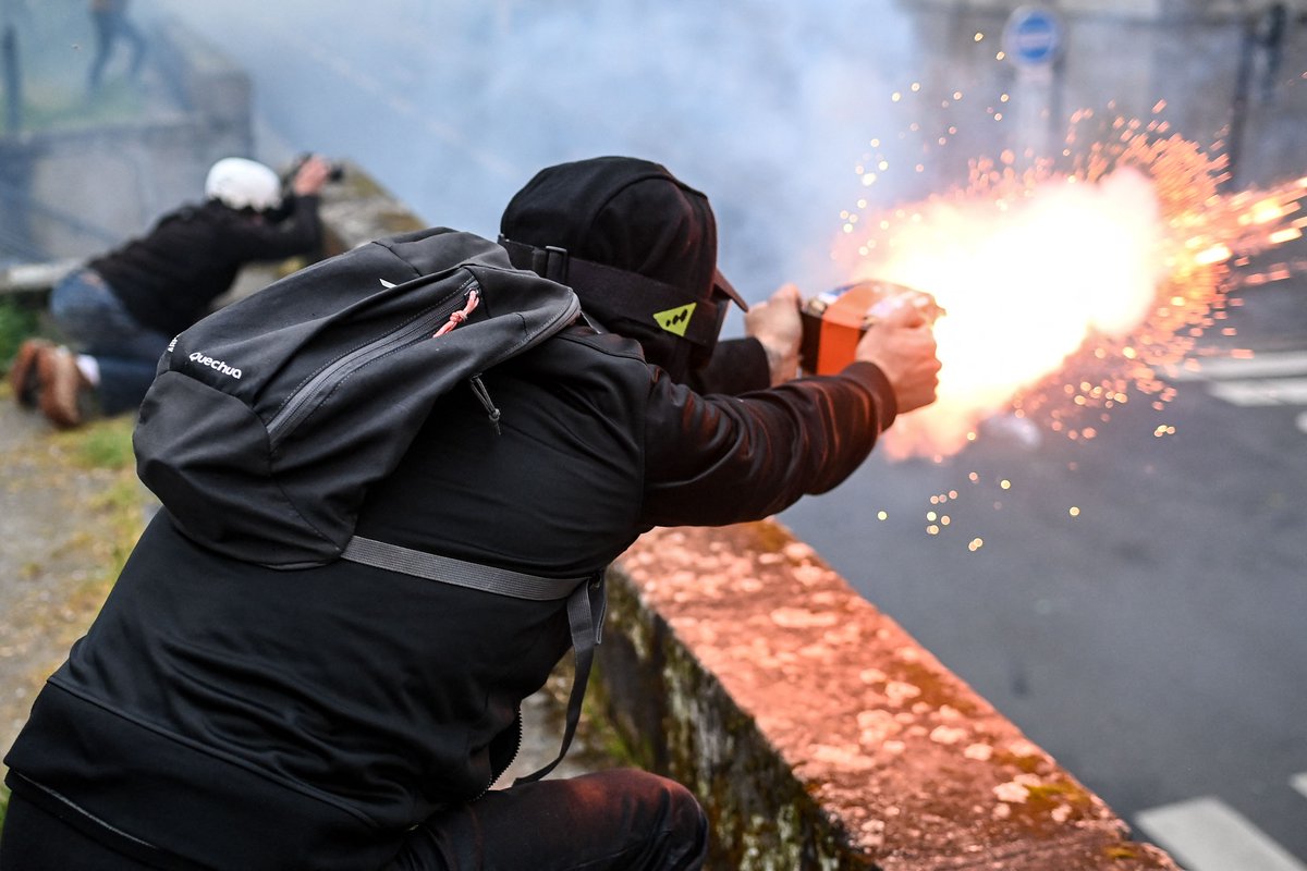 Nantes, France – A protester shoots fireworks at French police units during a nationwide strike against President Emmanuel Macron's widely unpopular pension reforms.