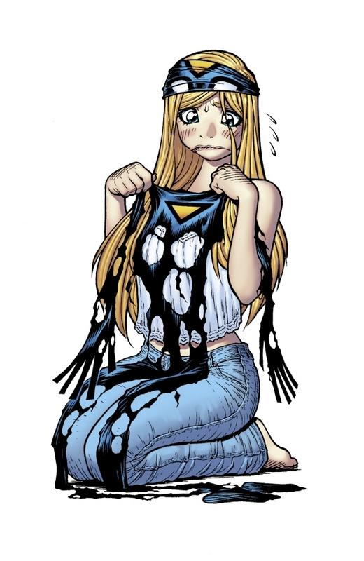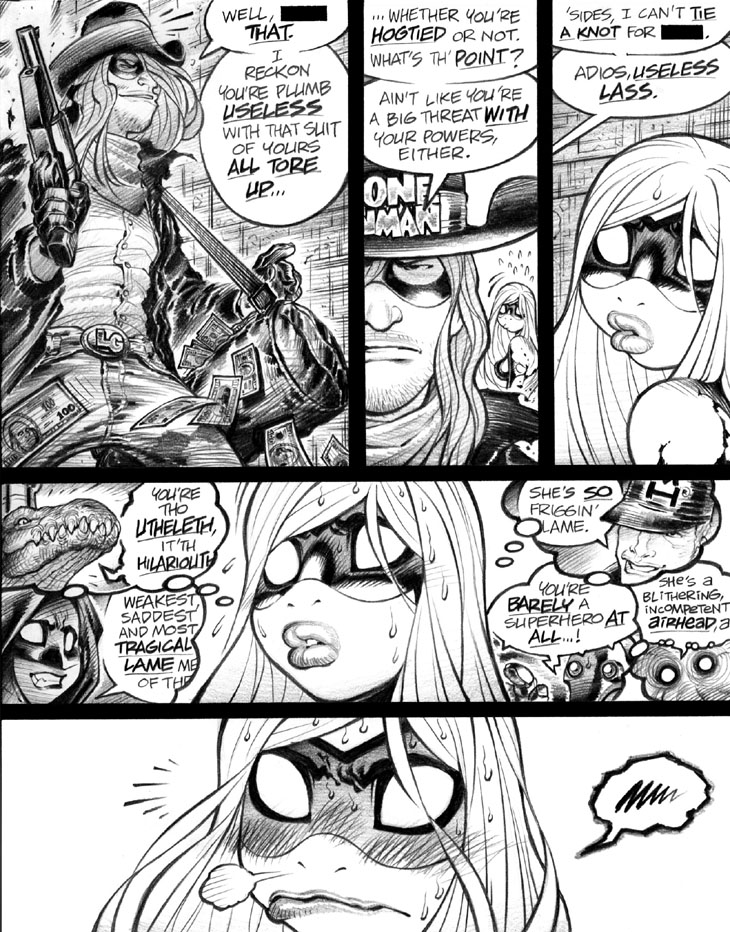 Emp is very lacking in self-confidence & consistently traumatized as she watched her father die of an anuerysm in front of her as a child. She's often sexually assaulted/tied up in her work as a superhero because no one takes her seriously.