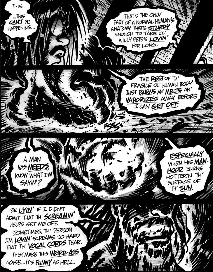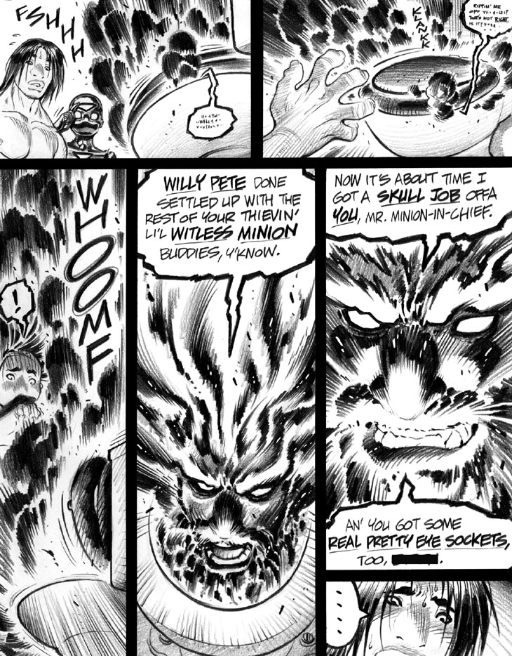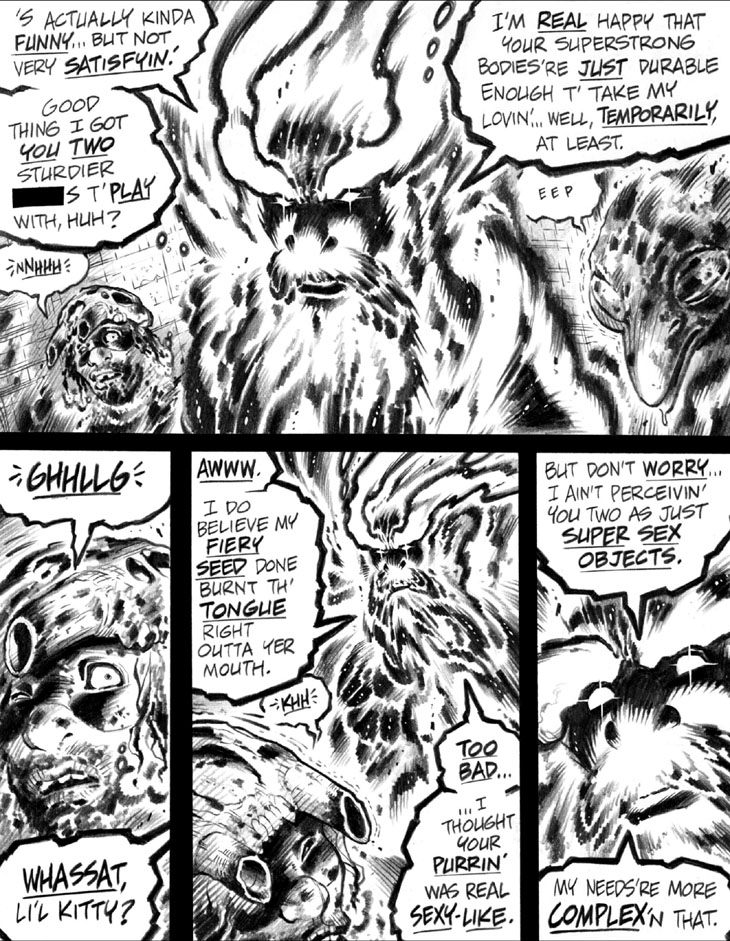 Last but not all of them is Willy Pete, a man turned fire elemental, or maybe a fire elemental that gained sentience and thinks he's a man, is a Southern sounding supervillain with a penchant for... well.