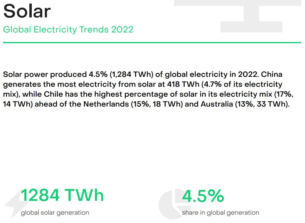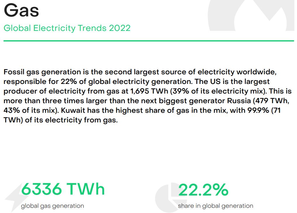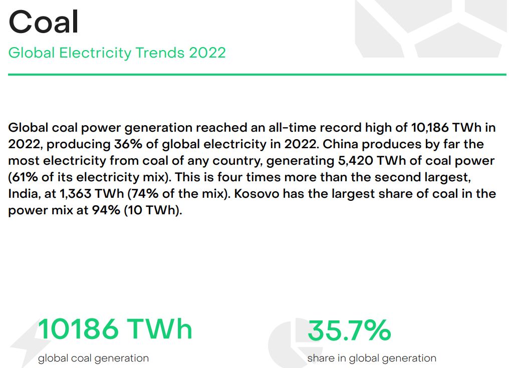 Nel 2022 sono stati prodotti 10.186 TWh da carbone, 6.336 da gas, 2.160 da eolico, 1.284 da fotovoltaico e 825 da altri combustibili fossili.