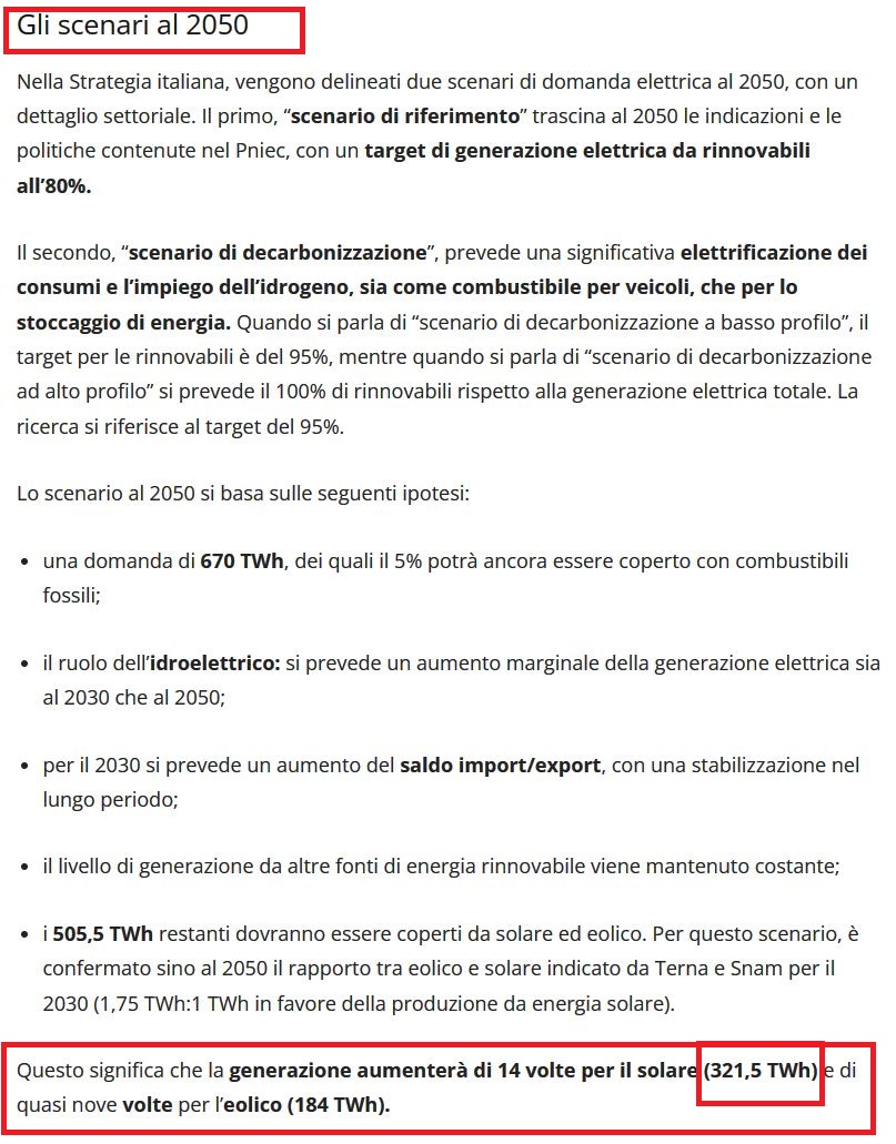 I piani di sviluppo per l'Italia al 2050 prevedono la produzione di 321 TWh/anno da fotovoltaico. Ricordando che 1 m2 di questi miracolosi pannelli produce non più di 140-150 kWh/anno,