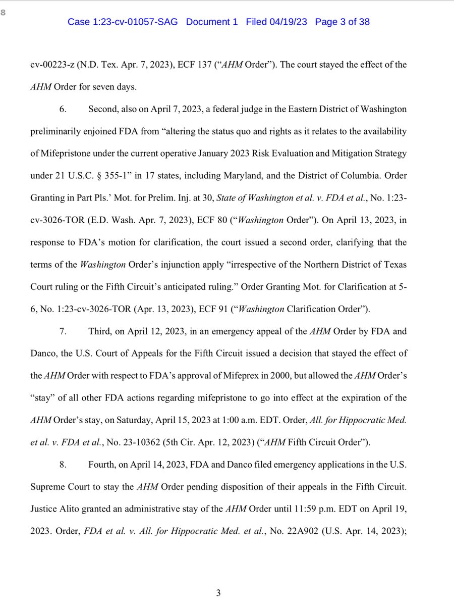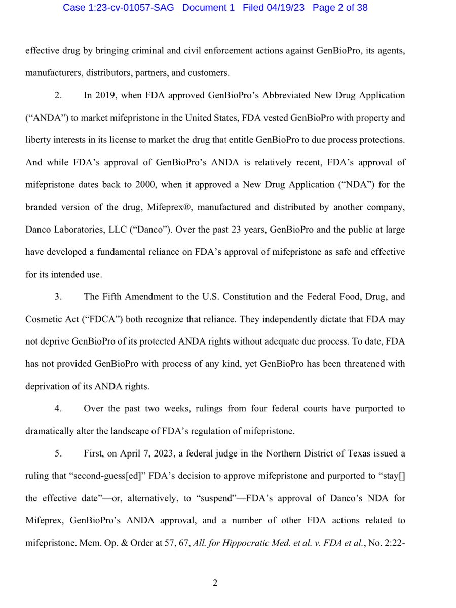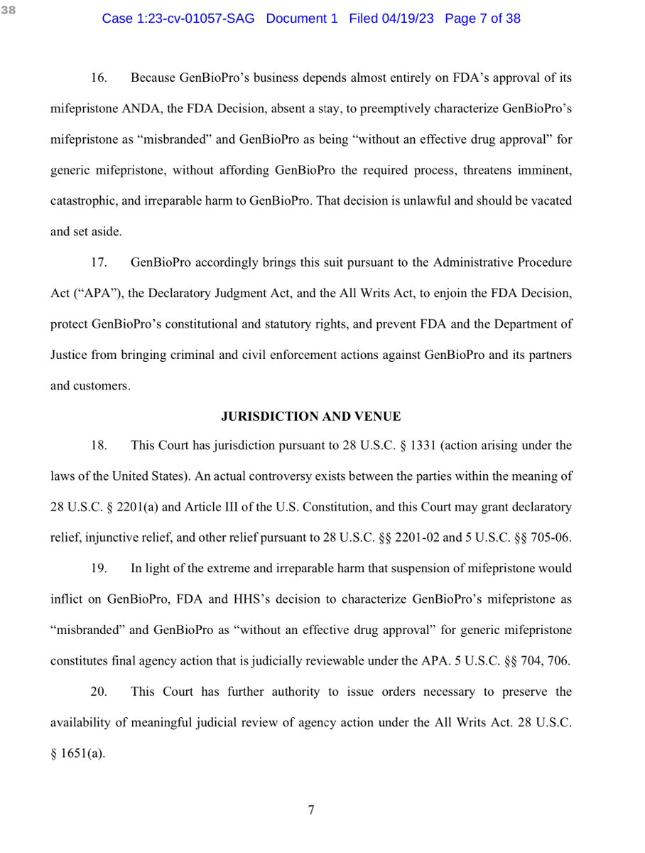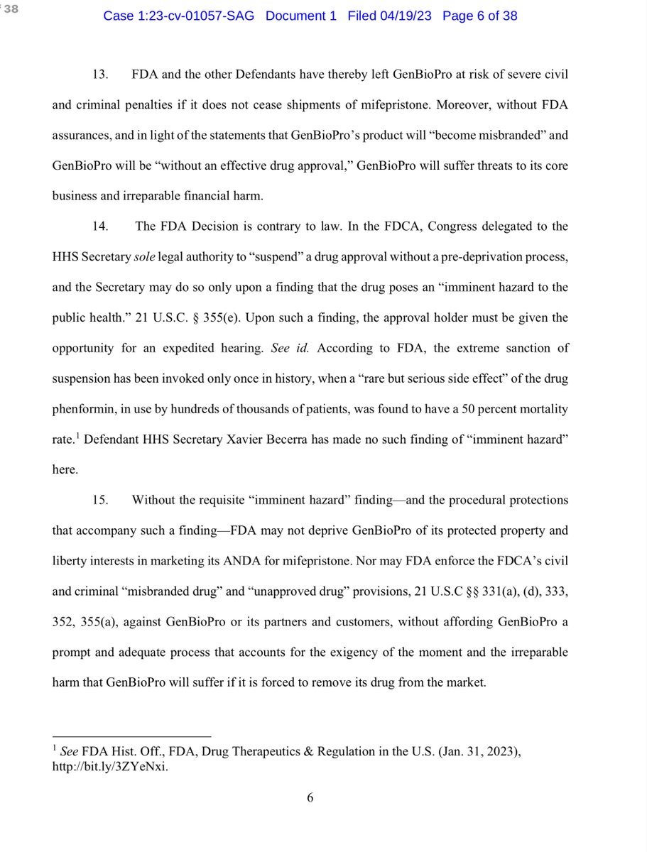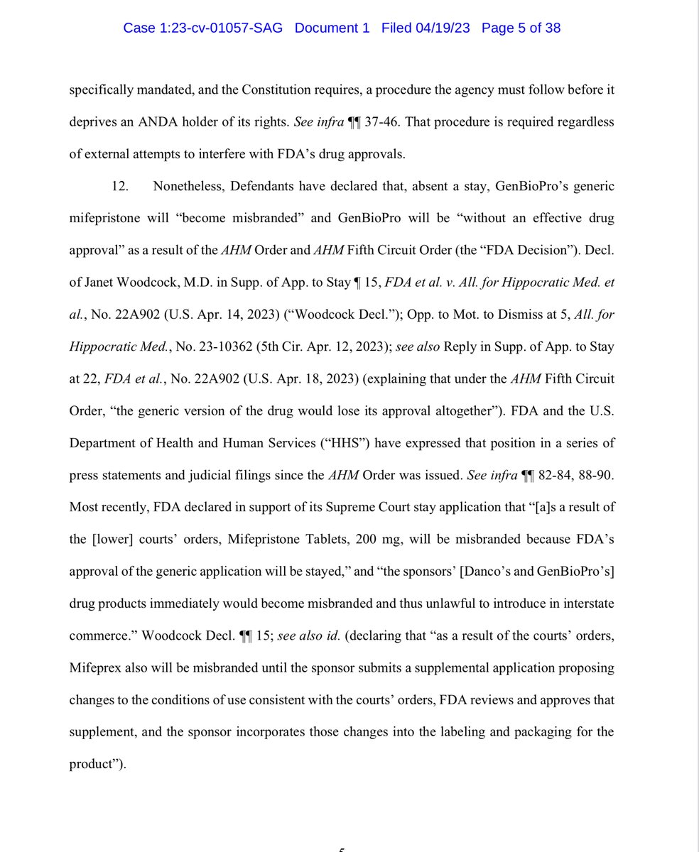 “…ANDA for mifepristone. Nor may FDA enforce the FDCA’s civil and criminal “misbranded drug” and “unapproved drug” provisions, 21 U.S.C §§ 331(a), (d), 333, 352, 355(a), against GenBioPro or its partners and customers, without affording GenBioPro a… twitter.com/i/web/status/1…
