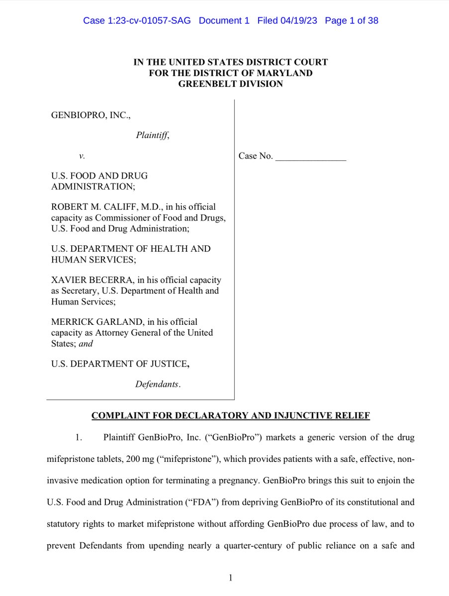 GenBioPro Inc., (generic for mifepristone) files with SCOTUS citing: