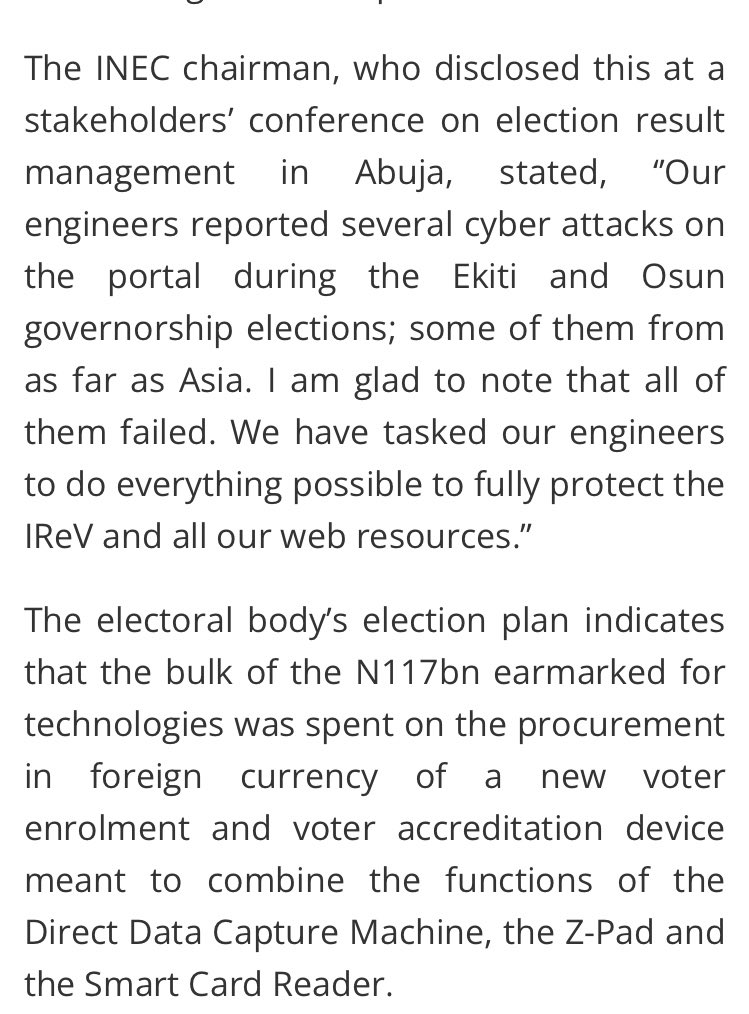 Made Provision for the electronic transmission of election results, it isn’t mandatory. Prof mahmood had to decide against electronic transmission to beat the opposition to the game of hacking. The ekiti and Osun elections witnessed serious cyber threats against iNec server that