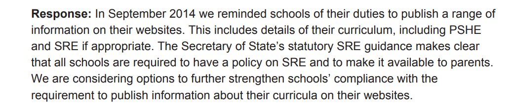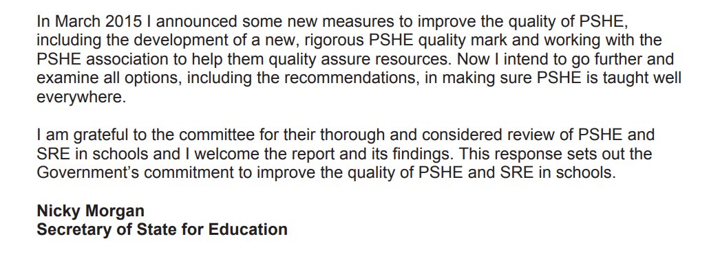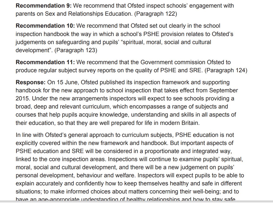 Government response to the House of Commons Education Committee report ‘Life Lessons: PSHE and SRE in schools’ published in July 2015. A full public inquiry is needed into how the DfE's actions have caused the current safeguarding disaster in schools. assets.publishing.service.gov.uk/government/upl….