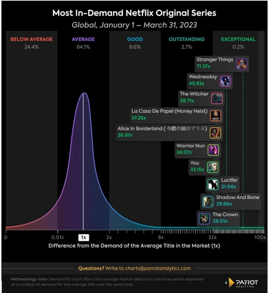 Most of Netflix's viewer activity is on content Netflix licenses from other studios, not their own original content. In the U.S., seven of the 10 most in-demand shows available on Netflix in the first quarter of 2023 were licensed.
