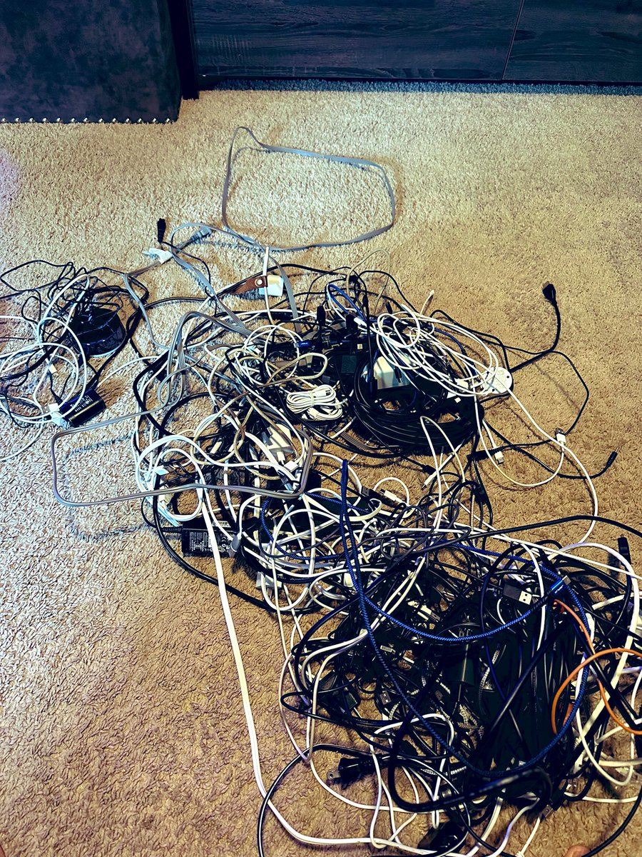 I just pulled out all the stray cords I’ve collected and thrown in my junk drawer over the years. I’m finally going to go through and label each one so I know WTF it goes to. There’s probably like 20. HDMI cables and iPhone chargers