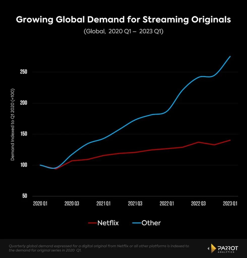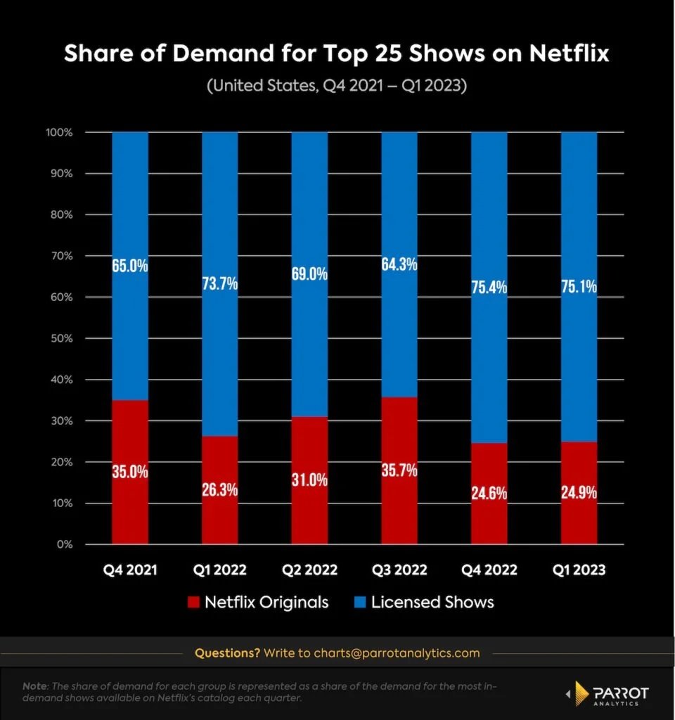 Most of Netflix's viewer activity is on content Netflix licenses from other studios, not their own original content. In the U.S., seven of the 10 most in-demand shows available on Netflix in the first quarter of 2023 were licensed.