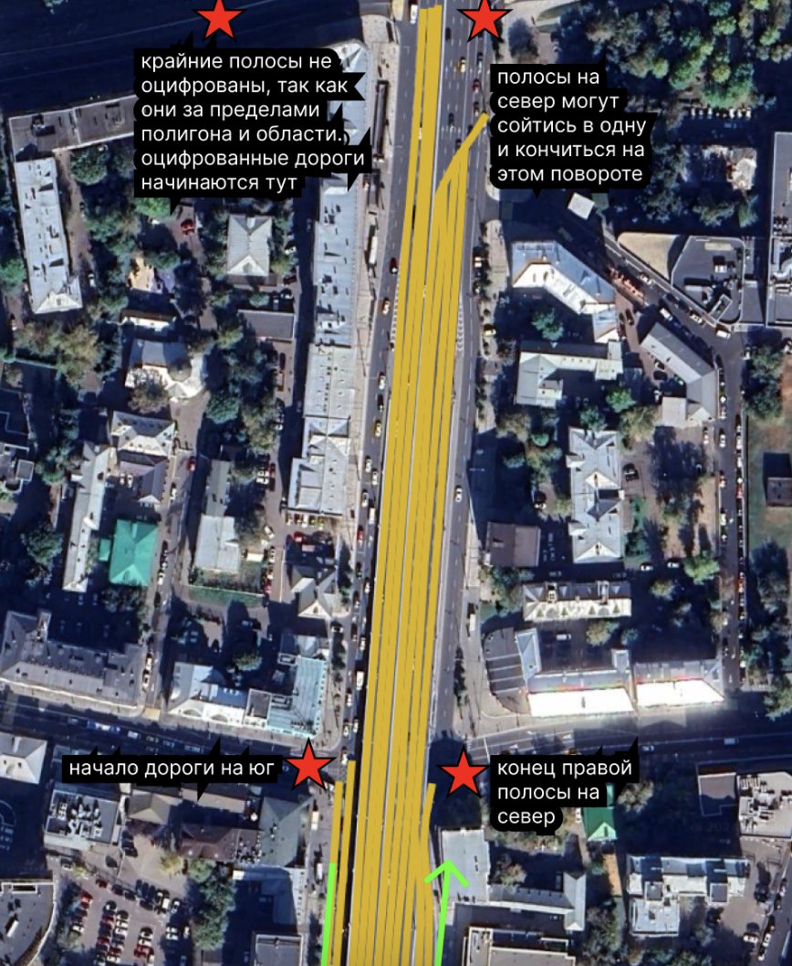 2 соединила все дороги в пределах полигона и за его пределами в зависимости от наличия перекрестков и начал дорог. показала по какому принципу цифровала все полосы и почему именно так
