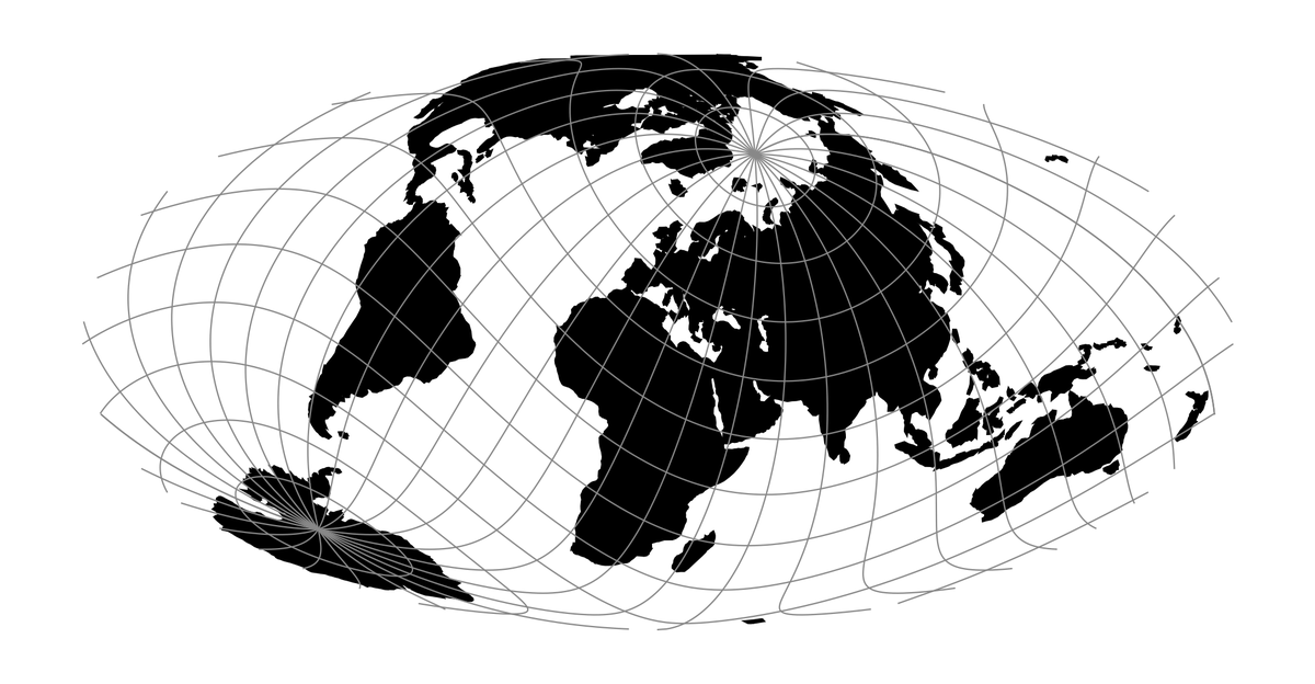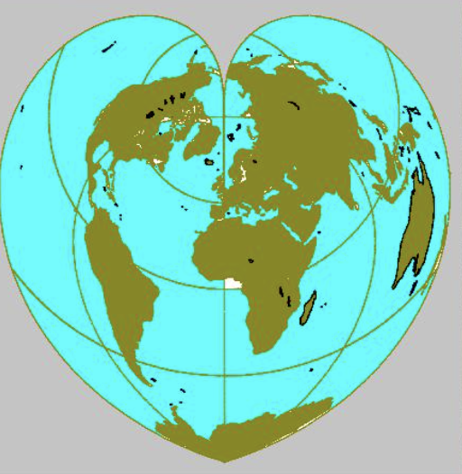 Кордиформная (в форме сердца) проекция Вернера. Северные районы на ней выглядят более-менее, если не учитывать северный полюс. Южная Америка, Африка и тем более Антарктида выглядят жутко