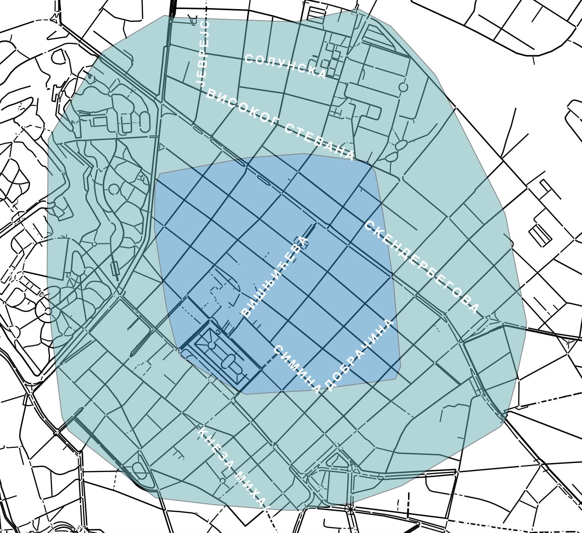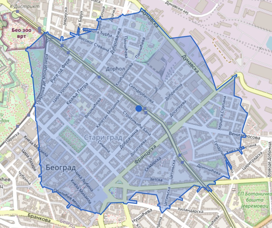 Вот область, показывающая изохроны для 10 минутной пешеходной доступности на одну из точек в центре Белграда