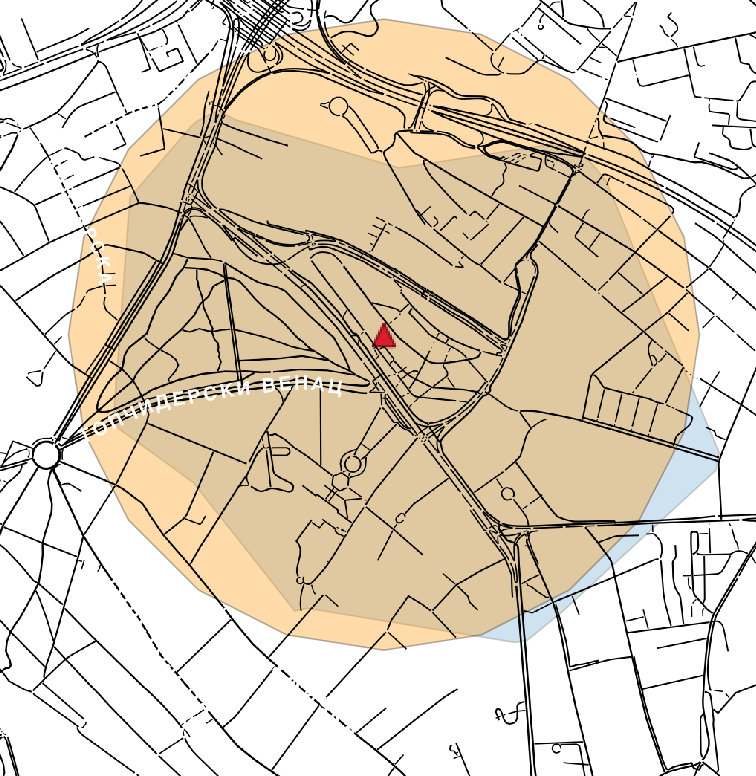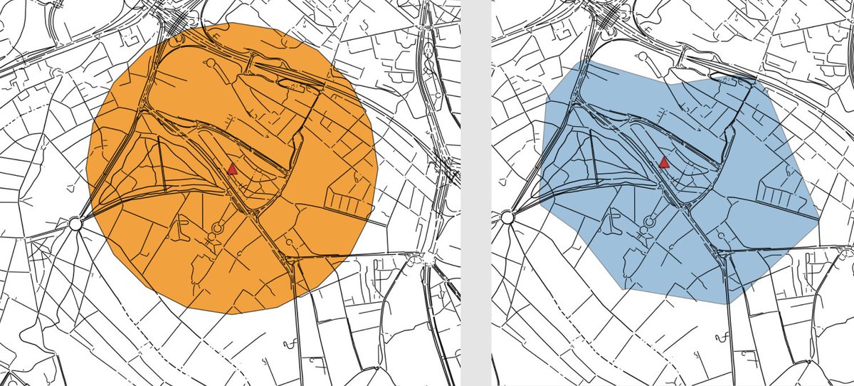 Как выглядит 1 км просто вокруг точки и как выглядит 10-минутная изо-обл