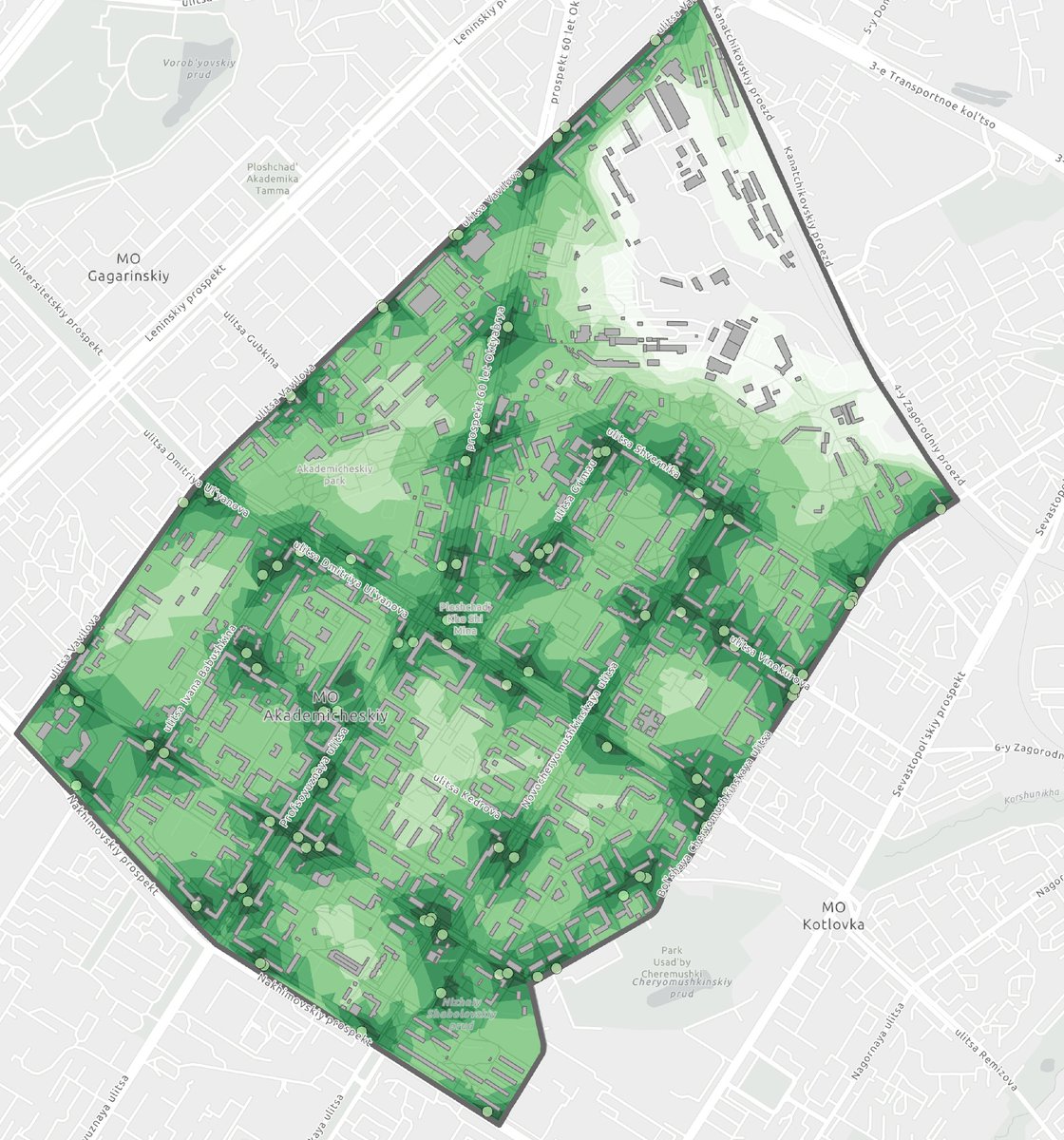 вот карта, которую я когда-то делала для остановок автобусов в академическом районе москвы. Чем более зеленый цвет, тем удобнее добираться до остановки. А вот северная часть района вообще не очень обеспечена остановками, там жить неудобно (немудрено. там просто промзона)