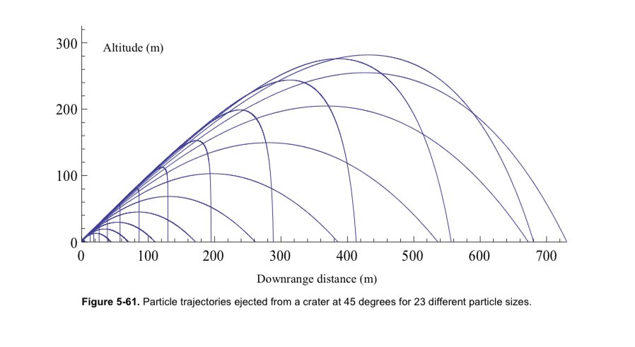 4/ You can see in the plots that small particles travel straight out at high velocity, then atmospheric drag stops them and they fall straight down. So we should be able to determine the initial velocity they had to end up falling 5 miles away.