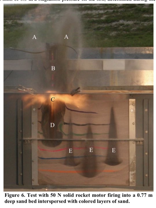 6/ The crater shapes were informed by experiments firing rocket motors into regolith so it wasn’t arbitrary, but at the time we had no models that integrated sand + gas that we could trust. (We still don’t have fully benchmarked models.)