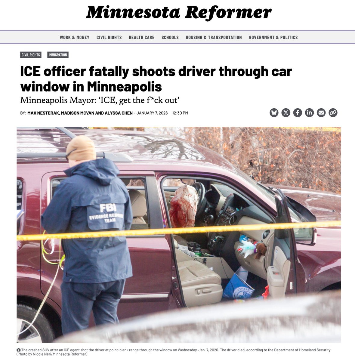 Two days ago, Renee Good was fatally shot by ICE. The Minnesota Reformer broke the story, posting a video of the shooting, comparing it to “the murder of George Floyd”. /2 Image