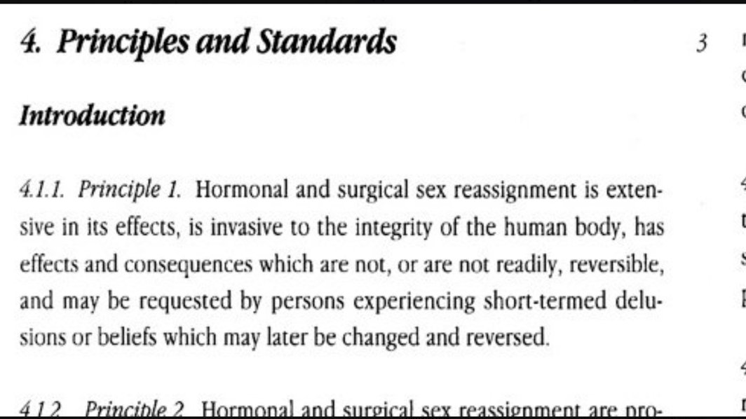 4./ Tragically, @wpath's Standards of Care no longer carry a warning they did until 1998 (Principle 1) that sex reassignment "may be requested by persons experiencing short-term delusions or beliefs which may later be changed and reversed." They urged psychiatric oversight.