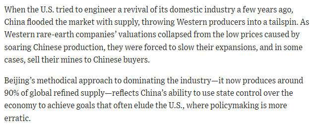 Very useful WSJ report on how China gained control of rare earths processing/ permanent magnet production -- and how it kept control
