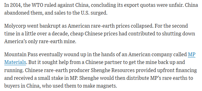 "Beginning around 2005, China’s government tightened the screws, levying export taxes on rare earths that made it costlier for Western magnet makers to churn out products ... Rare-earth production became so limited in the West that an American company, Molycorp, attempted to revive the Mountain Pass mine and make its own magnets"