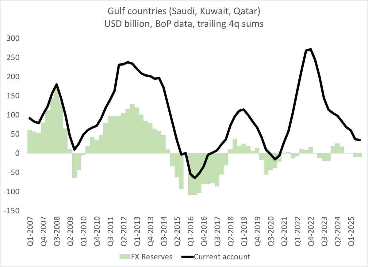 And the GCC countries (no quarterly data for the Emirates, but its surplus is roughly the size of Qatar and Kuwait combined) no longer really stash away their oil surplus in liquid dollar reserves --