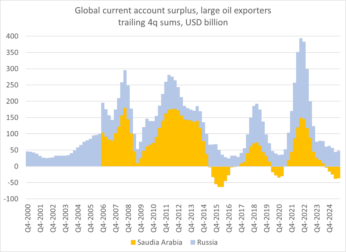Saudi Arabia's external deficit offset Russia's surplus, so the two biggest oil exporters (~ 15mbd of exports together) were not generating petrodollars, petroeuros or petroyuan