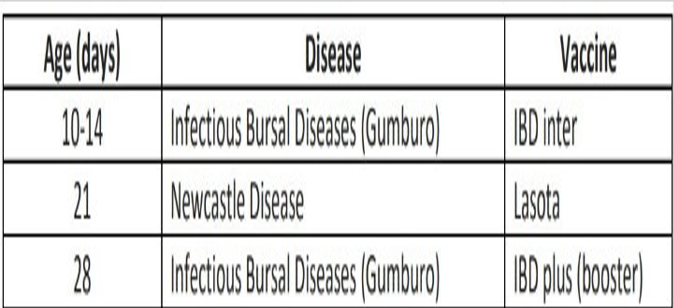 Referring to the common diseases, broilers are mainly vaccinated 3 times (Refer to the table attached)