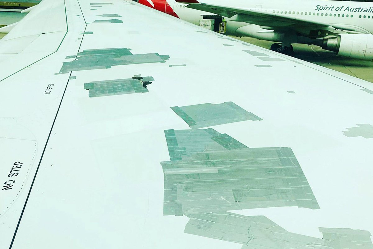 43\57 в свои социальные сети безобразные картинки, портящие имидж авиакомпаний, про алюминиевый скотч. Да, Airbus рекомендует заклеивать повреждения на A350 нашим любимым алюминиевым скотчем. Но когда эти повреждения везде - сложно говорить о том, что проблема косметическая.