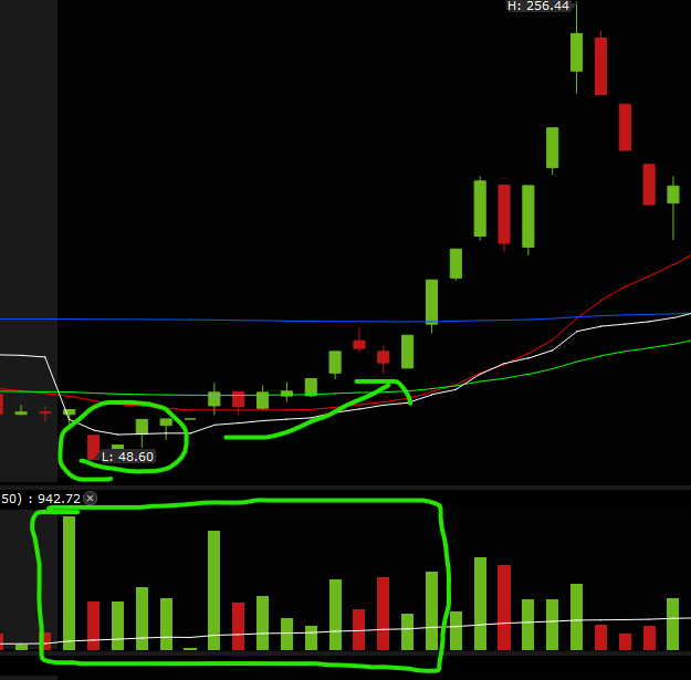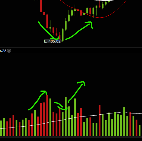 • always wait for a big buyer to step in first (big green bar) then selling pressure to weaken