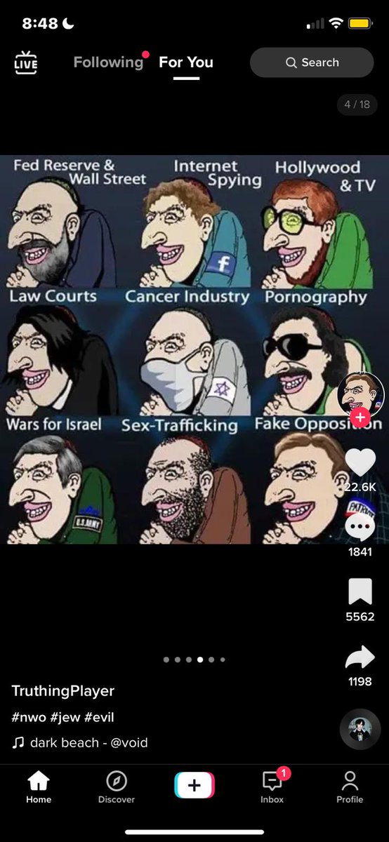 It was part of a slide show with a host of antisemitic, far right images - 18 in total - in his 'For You' recommendations tab on TikTok. The video even has the hashtags 'jew' and 'evil' but got recommended by the algorithm anyway🤷♂️