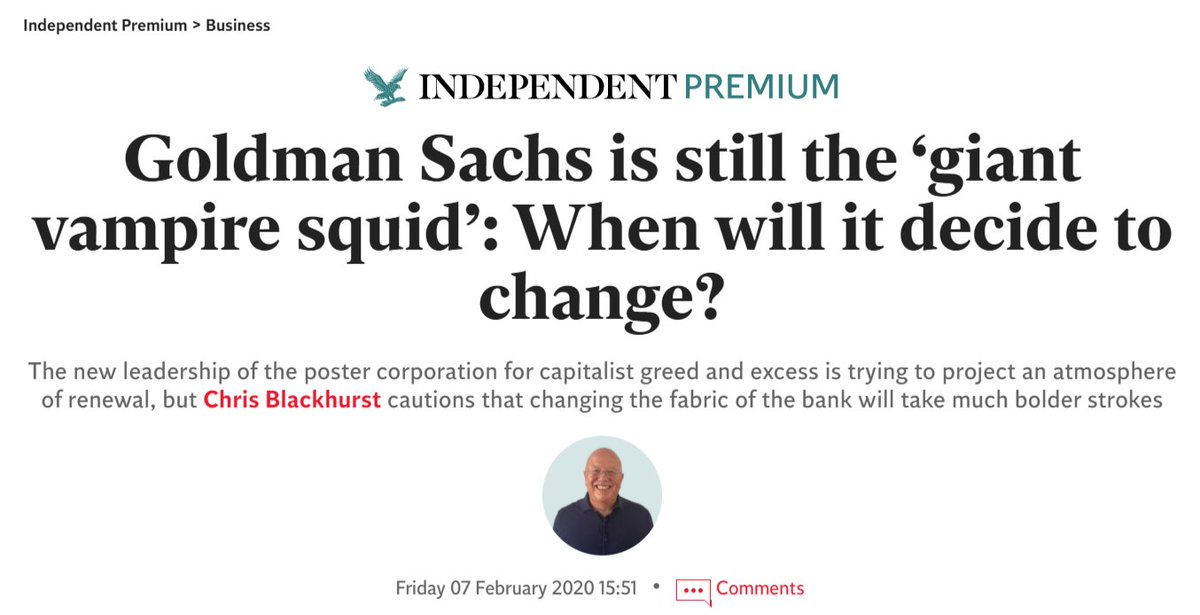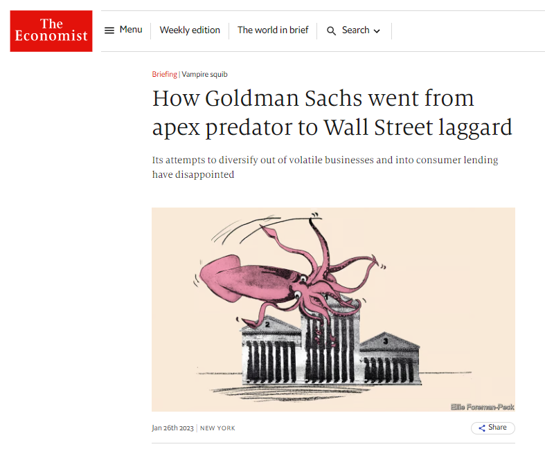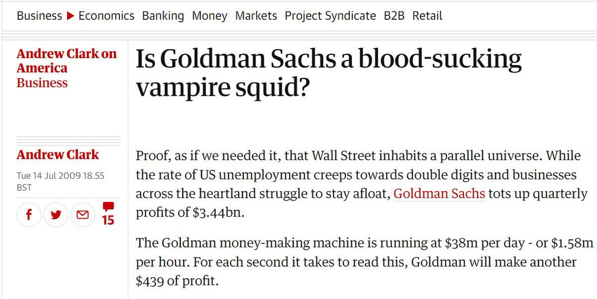 Then the squid. Yes, Sharp worked for Goldman Sachs, which was famously described in @RollingStone as "a great vampire squid wrapped around the face of humanity, relentlessly jamming its blood funnel into anything that smells like money" rollingstone.com/politics/polit…