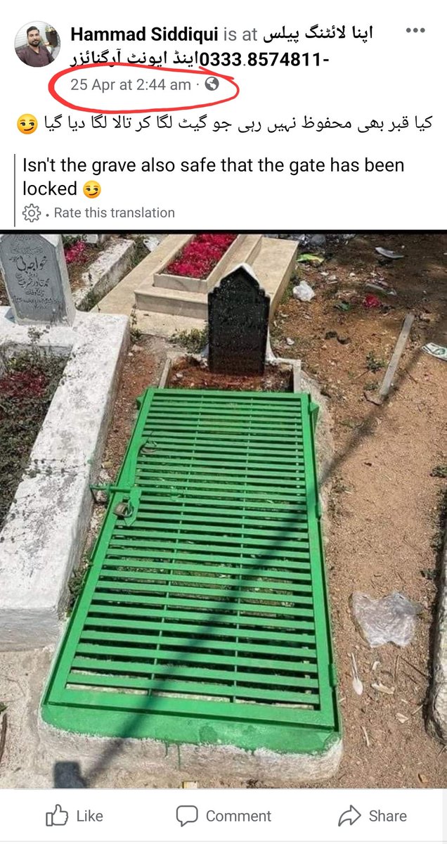On being informed about the image of this grave being circulated with the claim that it is from Pakistan, Muqtar Sahab refuted it and added that the grille was constructed also with a view to preventing people from stamping on the grave since it was right in front of the entrance