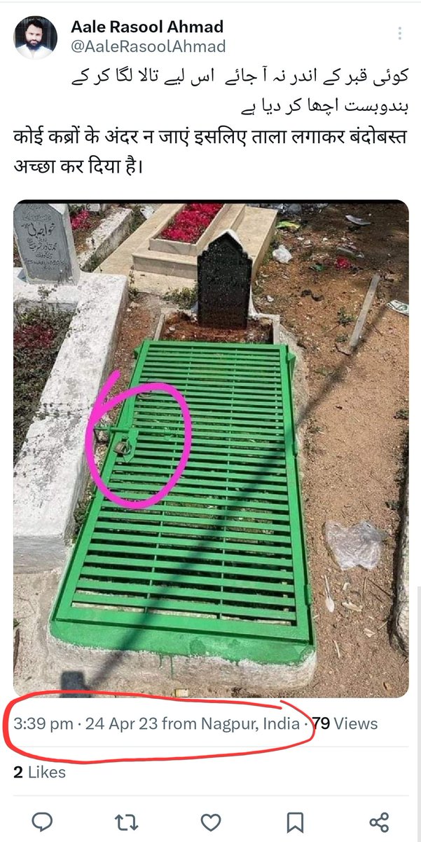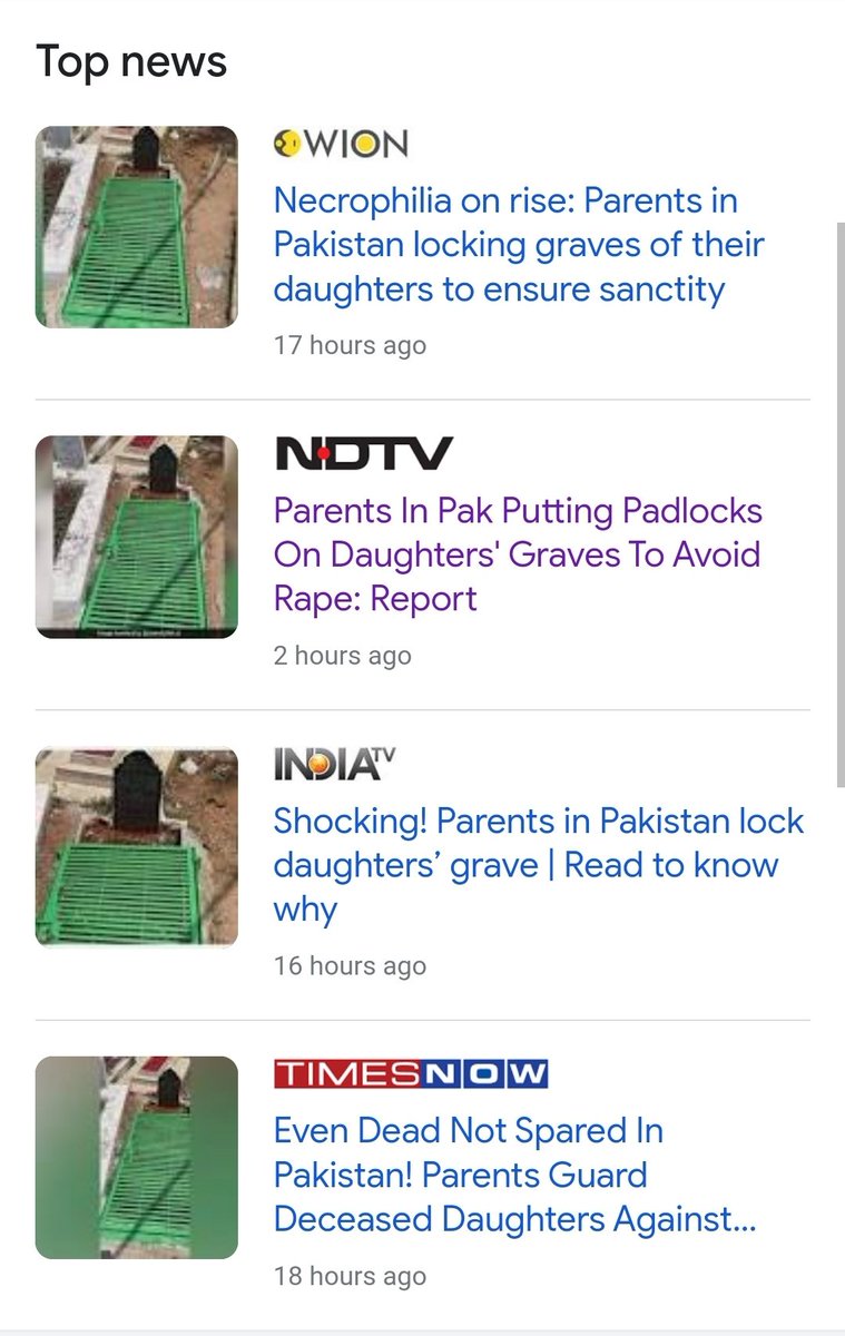 Media outlets including ANI shared the photo of a padlocked grave with the claim that parents in Pakistan were locking daughters' graves to avoid rape. The photo is from Hyderabad, India and the grave is reportedly of an aged woman.