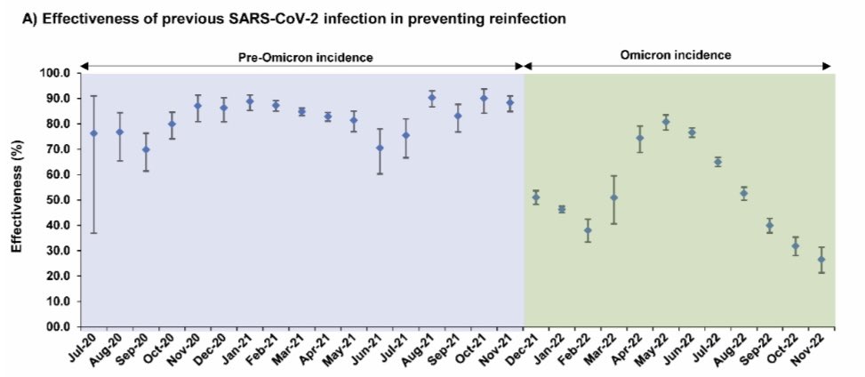 Previous-infection effectiveness against reinfection was strong before Omicron, but declined with time after a wave & rebounded after a new wave. Effectiveness dropped immediately after Omicron emergence from 88.3% in November 2021 to 51.0% in December 2021. 5/