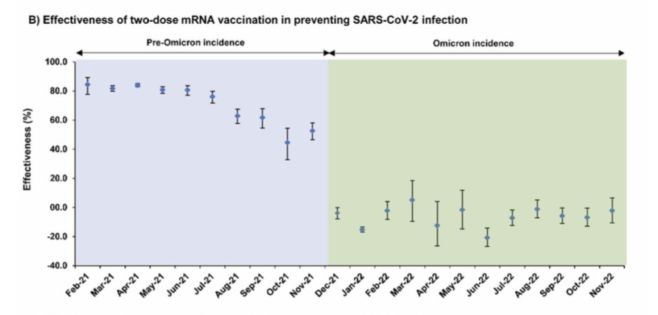 VE declined linearly by ~1% point every 5 days. After Omicron, VE dropped suddenly from 52.7% in Nov 2021 to negligible levels in Dec 21. 6/