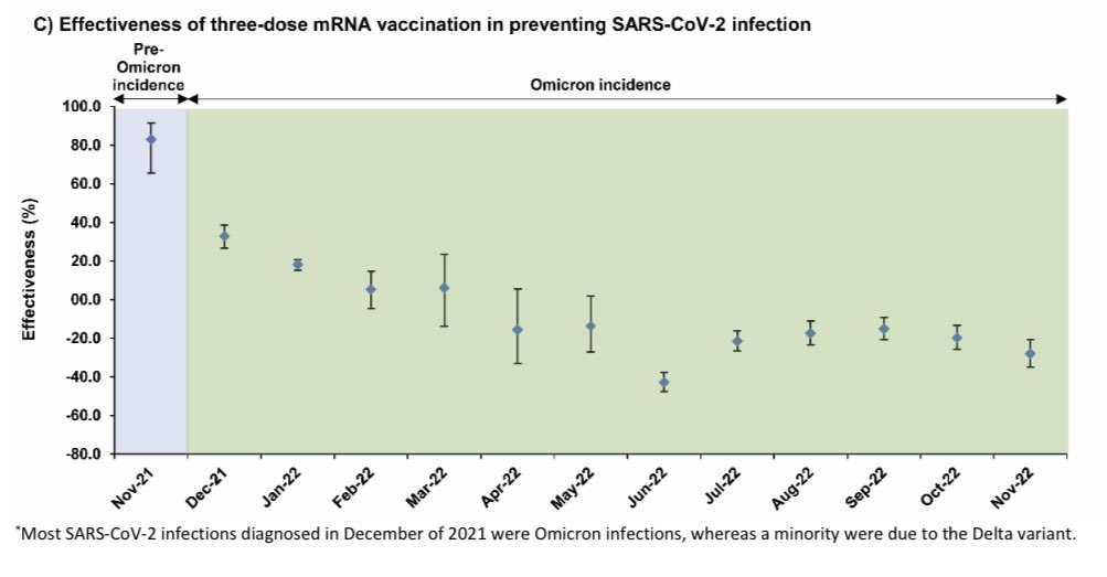 Booster effectiveness dropped immediately after Omicron emergence from 83.0% in November 2021 to 32.9% in December 2021, and continued to decline thereafter. 7/