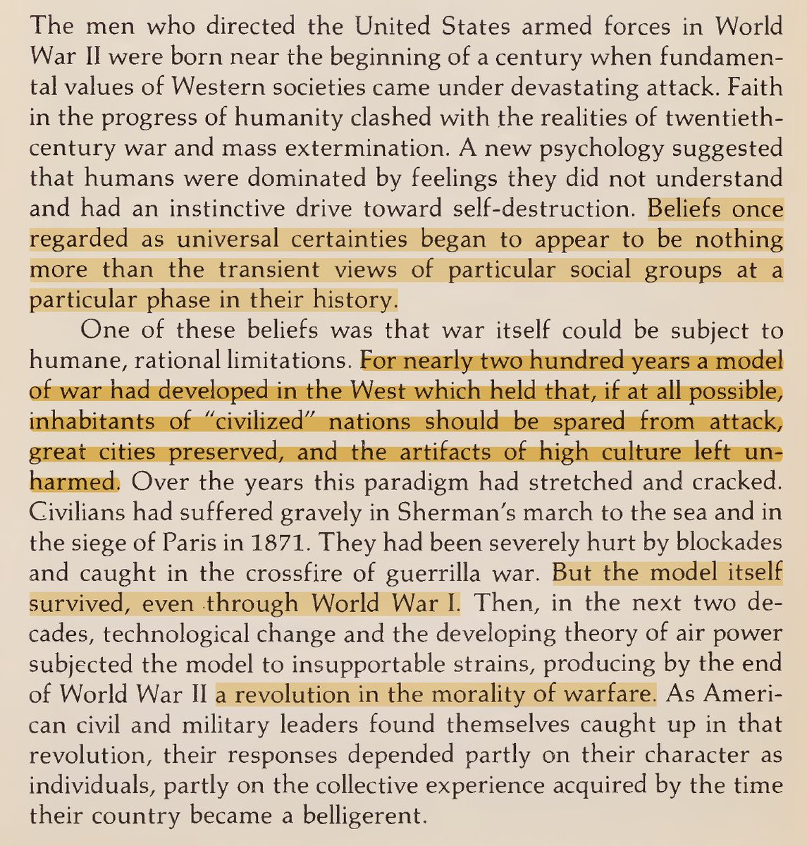 "Jus in Bello" traditions had endured for nearly two hundred years in the West. But after WW I, the new theories of air warfare and the new technology of the heavy four-engine bomber set the stage for the indiscriminate destruction of cities and the mass-killing of civilians.