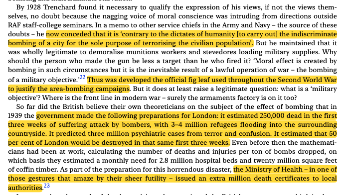 The strategy of attacking civilians came to prominence in the RAF in the person of Sir Hugh Trenchard. Trenchard developed the “official fig leaf” used by the British during the war – that the attacks were aimed at munitions workers, rather than civilians in general.