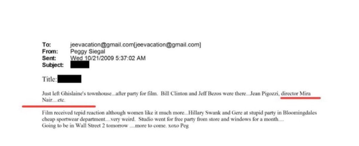 Mira Nair, la directora india “progre” de Hollywood, aparece en un email de 2009 de Peggy Siegal a Epstein: Fiesta en la casa de Ghislaine Maxwell con Clinton, Bezos y “DIRECTOR MIRA”. ¿Qué hacía Nair en el nido de pedófilos? Epstein usaba estas “reuniones” para comprometer élites.