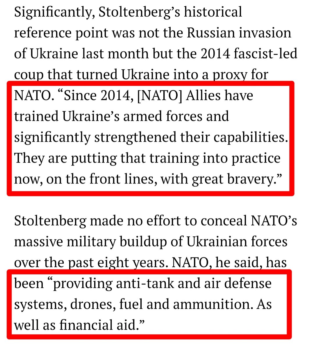 We now know, first hand, that NATO has been preparing for this conflict since 2014. Back in March, 2022 at NATO summit the head honcho Jens Stoltenberg stated so himself. wsws.org/en/articles/20β¦