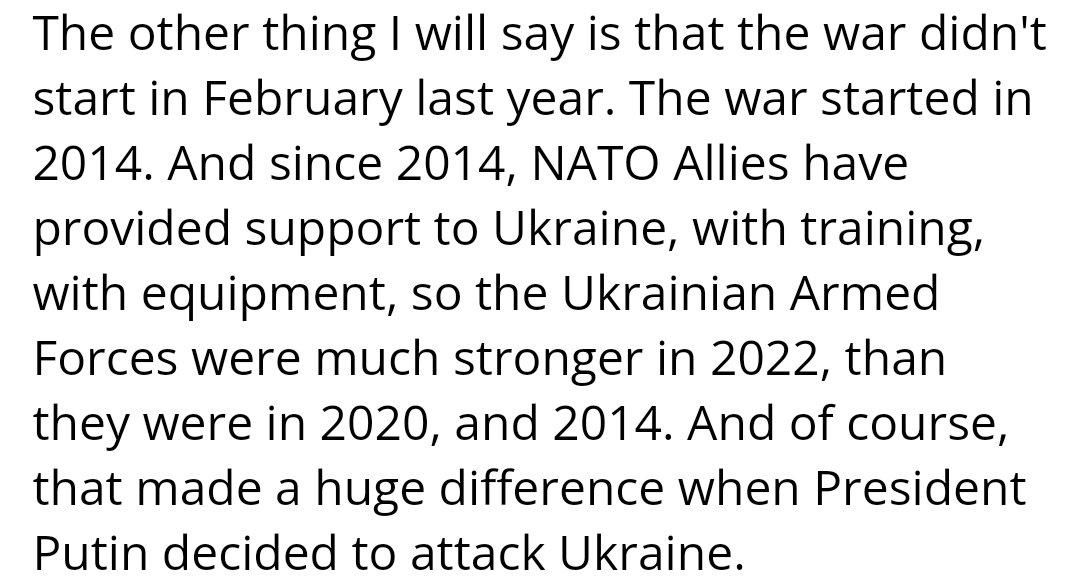 In February 2023 Stoltenberg has reaffirmed NATO's involvement in arming and training Ukraine. "The war didn't start in February last year. The war started in 2014. And since 2014, NATO has provided support to Ukraine, with training and equipment." nato.int/cps/en/natohq/β¦