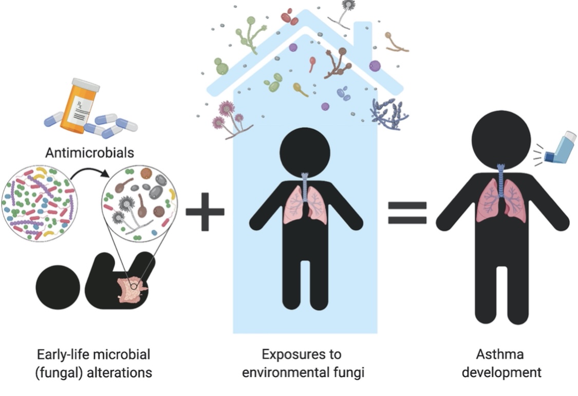 Gut fungi respond to antimicrobials, which when given early in life can increase an infant's risk to asthma. We propose that fungal alterations/blooms contribute to immune miseducation events that lead to later sensitization to environmental molds. 3/n